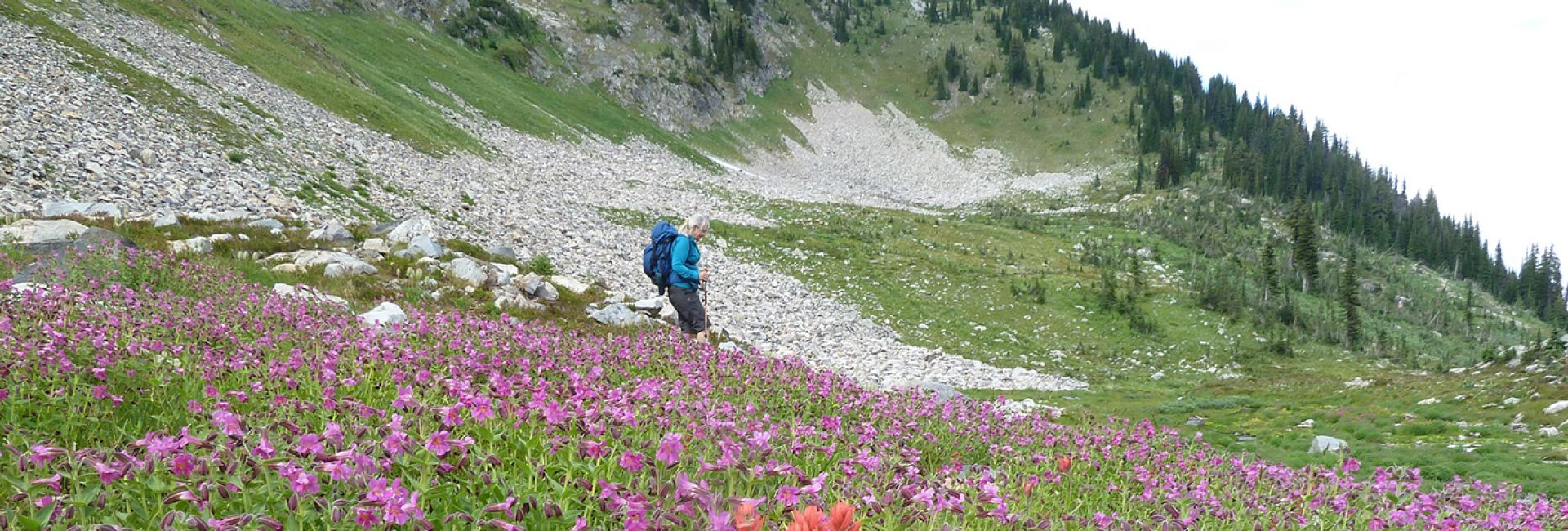 It is true wilderness hiking in a unique and rarely explored mountain range. The terrain is vast, the alpine meadows are teeming with flowers and the peaks are majestic. From sparkling alpine tarns to the distant mountain ranges, there is always beauty to behold. Multi-day alpine hiking trips are offered through beautiful alpine areas filled with flowers, lakes and rocky peaks and ridge lines. Stunning panoramic views of the Valkyr, Valhalla and Monashee mountain ranges greet you at every turn.