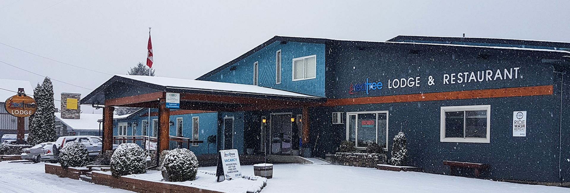 The refurbished guestrooms include television, ensuite bathroom, mini fridge, in-room coffee and microwave. The second floor room balconies offer great views. Amenities include free WiFi, laundry facilities, common kitchen for guests, indoor pool, sauna, hot tub and theatre room. The lodge is also pet friendly.